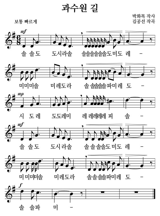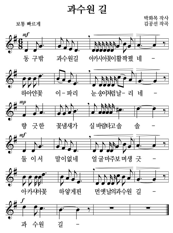 과수원 길 노래 동영상, 가사, 계이름, 악보