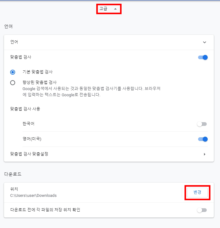 4. 다운로드 부분에서 '변경'을 클릭해서 내가 원하는 위치를 설정한다.