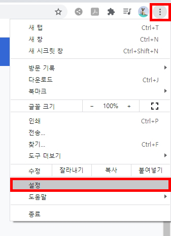 1. 크롬 브라우저 오른쪽 상단 맨끝에 '점세개'를 클릭한다.