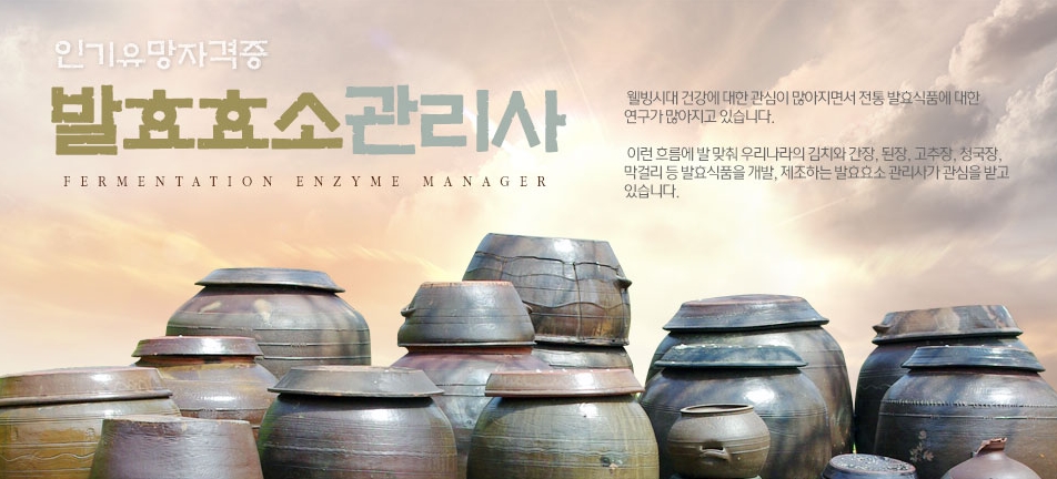 인스턴트나 가공식품을 많이 먹는 요즘 건강을 위해 발효식품과 효소에 대한 연구가 활발히 진행되고 있습니다. 효소는 동/식물의 미생물을 이용해 만들 수 있지만, 사람에게 유용한 물질로 변화시킨 것이 발효이고 새로운 물질이 생성되면 부패라고 합니다 따라서 우리 주면의 식용식물을 활용하여 건강에 유익한 효소를 포함하는 발효 호소 식품을 개발, 제조하는 전문가를 발효효소 관리사라고 합니다.