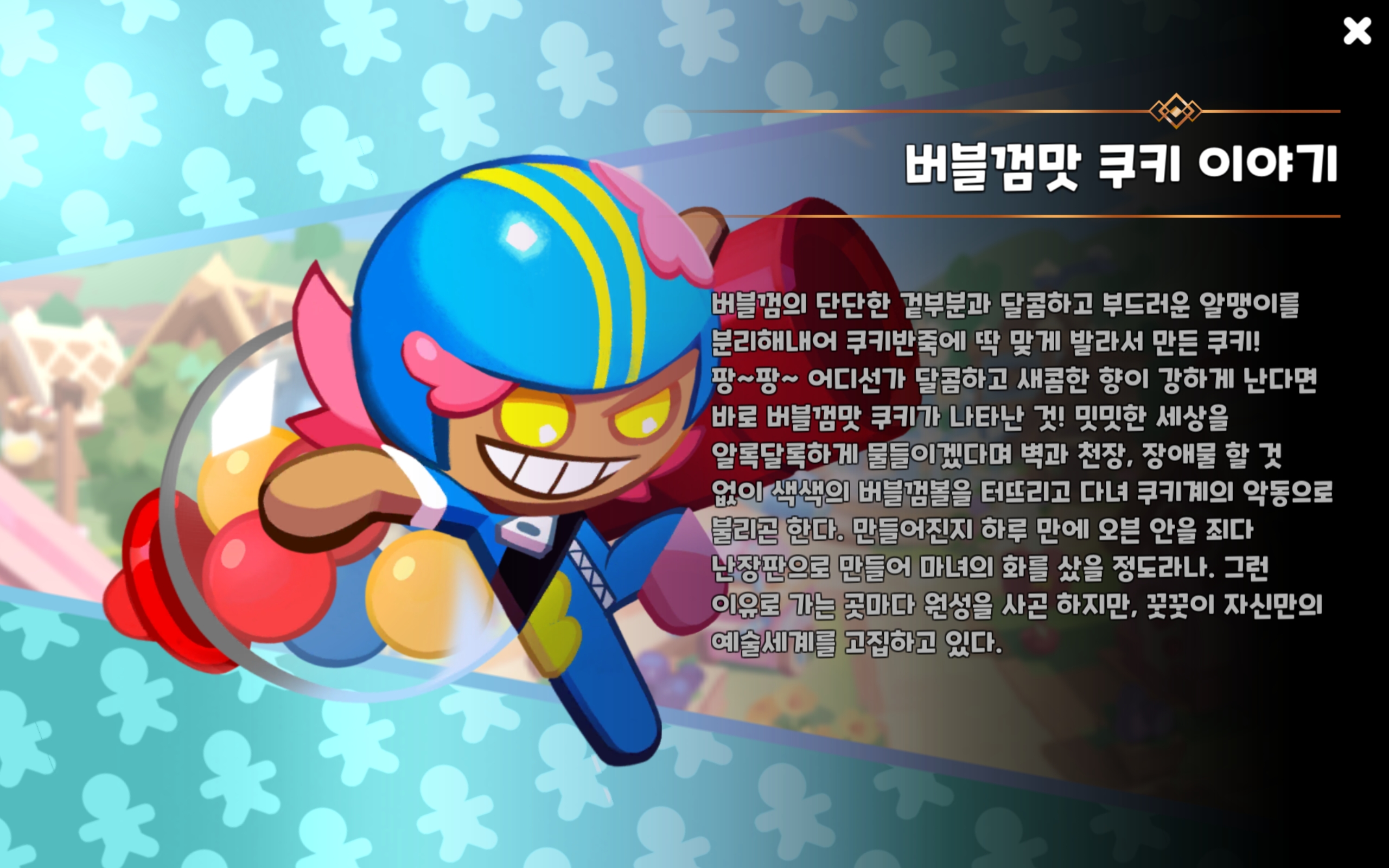 밋밋한 세상을 알록달록하게 물들이겠다며 벽과 천장, 장애물 할 것 없이 색색의 버블껌볼을 터뜨리고 다녀 쿠키계의 악동으로 불리곤 한다.