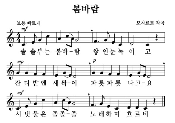 봄바람 노래 동영상, 악보, 가사, 계이름