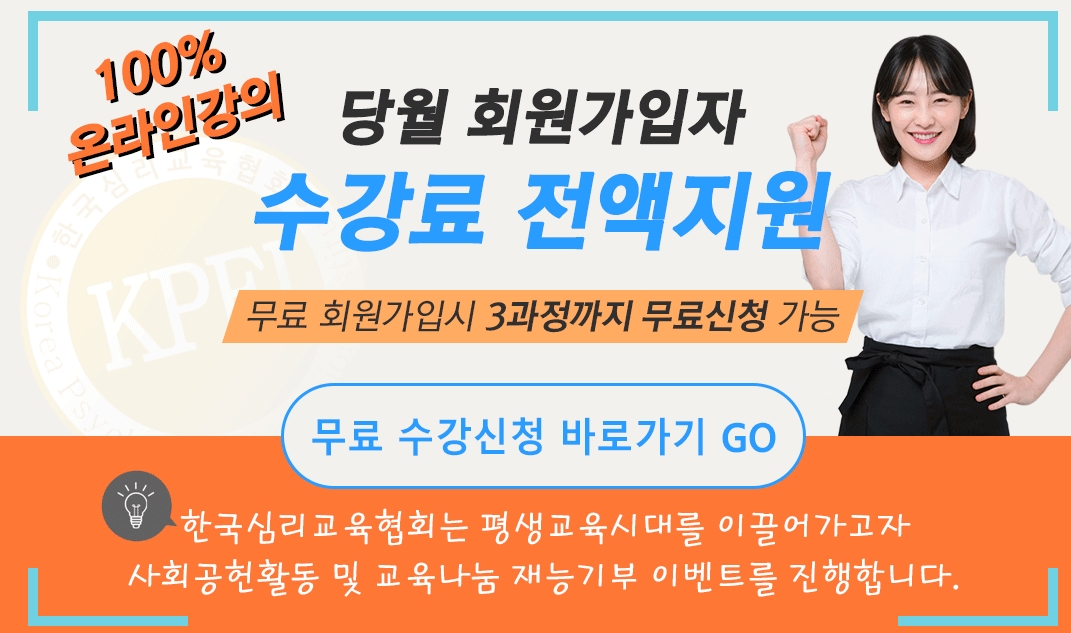 한국심리교육협회는 평생교육시대를 이끌어가고자 사회공헌 활동 및 교육 나눔 재능기부 이벤트를 진행합니다.