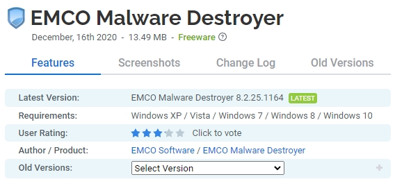 EMCO Malware Destroyer는 Windows PC의 개인용 바이러스 백신 보호를 구성하고 정기적인 빠른 맬웨어 검사를 수행하여 다양한 위협을 탐지 및 제거하는 데 도움 이 되는 무료 바이러스 백신 소프트웨어입니다.⚠ 참고: 이 제품은 더 이상 개발되지 않았으며 제대로 작동하지 않을 수 있습니다. 대안을 찾고 있다면 Malwarebytes 또는 Emsisoft Anti-Malware를 다운로드하는 것이 좋습니다. 초고속 검색 엔진을 갖춘 무료 개인용 바이러스 백신. Malware Destroyer는 개인 맬웨어 보호를 구성하는 데 도움이 됩니다.