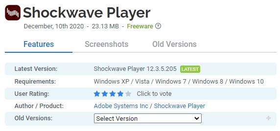 4억 5천만 개 이상의 인터넷 지원 데스크톱에 Adobe Shockwave Player가 설치되어 있습니다. 이러한 사용자는 눈부신 3D 게임 및 엔터테인먼트 , 대화형 제품 데모 , 온라인 학습 응용 프로그램을 포함하여 웹이 제공하는 최고의 콘텐츠에 액세스 할 수 있습니다.